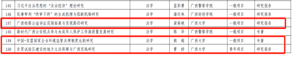 11月1日,2023年广西哲学社会科学研究课题立项名单公布公示,公司梁春艳、熊超、曹舒、董笃笃等4位教师申报的课题获得本次立项。此次广西哲学社会科学研究课题法学学科共立项17项,公司占比达到23.5%。