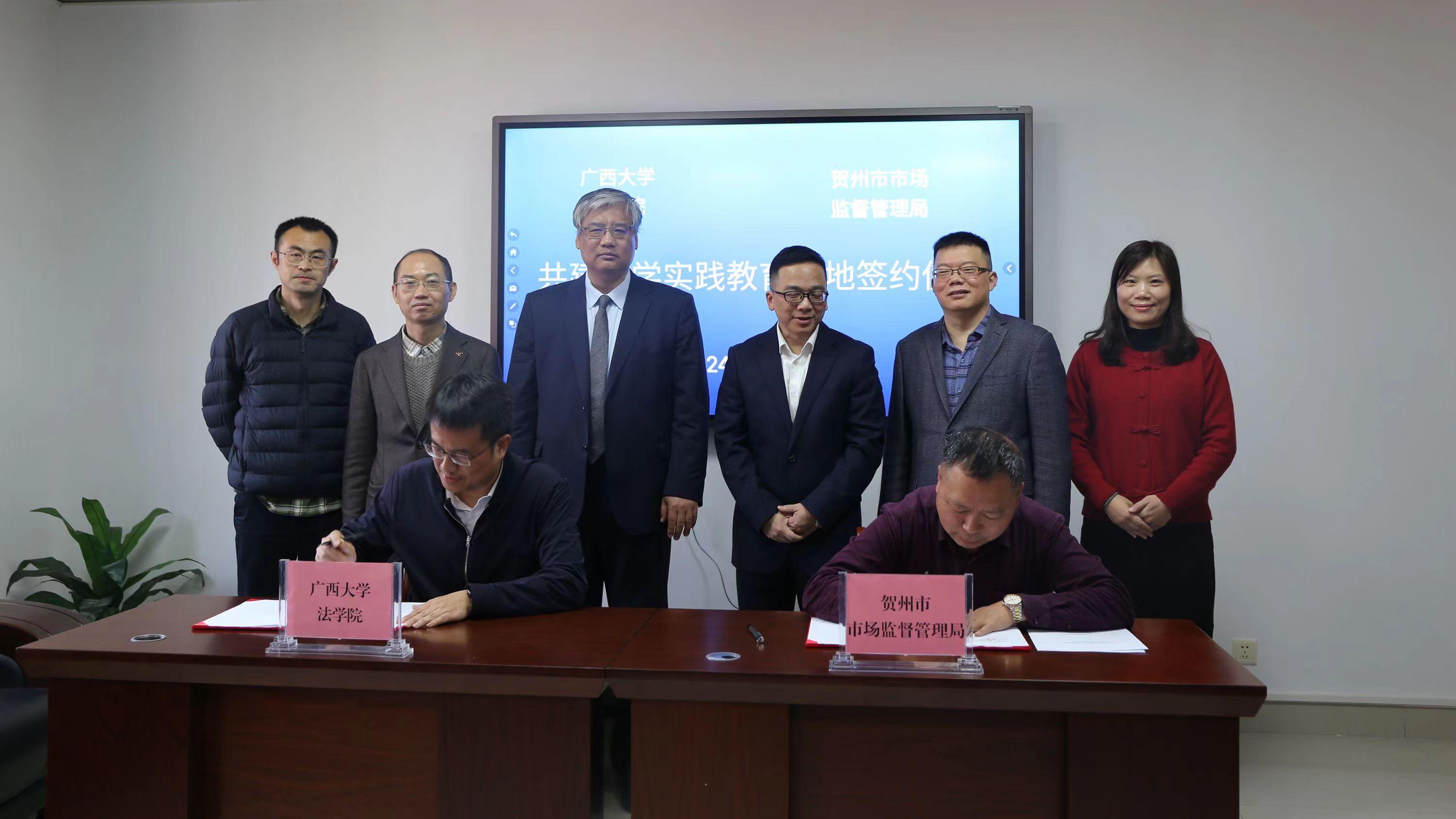 3月5日,公司与贺州市市场监管局共建“法学实践教育基地”签约仪式暨交流座谈会在贺州举行。院领导余云宇、许光耀与贺州市场监管局主要负责人共同签订了共建基地协议,并为“法学实践教育基地”揭牌。这是公司首次与市场监管实务部门共建实践教育基地。