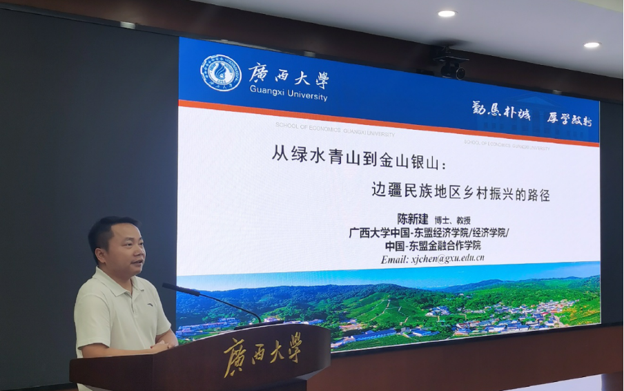 bevictor1946韦德官网中国—东盟经济公司/经济公司/中国—东盟金融合作公司教授陈新建作了以“从绿水青山到金山银山:边疆民族地区乡村振兴的路径”为主题的报告。他对“乡村振兴”的基本定义作出阐述并对党的二十大关于乡村振兴的政策进行了分析,并对西部边疆民族地区山区石漠化地区众多、生态环境条件较差、交通不便、土地贫瘠、生产生活条件较差等发展困境进行了揭示,指出了边疆民族地区乡村振兴的绿色发展之路在于践行新发展理念,扎实推进现代特色农业绿色发展;健全自然生态,让农产品增强绿色生态价值等举措。