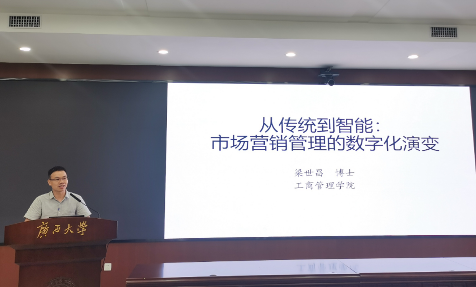bevictor1946韦德官网工商管理公司副教授梁世昌作了以“从传统到智能:市场营销管理的数字化演变”为主题的报告。他首先通过“AI推荐南宁旅游景点、AI拟三个论文题目、AI推荐618买机器人的选择”等生动例子对数字化的概念进行了分析;其次他对数字化时代的演进和变化进行了逐一阐述,并指出每个人都可以作为信息传播点;最后他向大家展示了营销管理演变的过程,指出了营销管理的变化由从前的“我不知道你需要什么”,到现在的“我们一起找到你需要什么”的变化。
