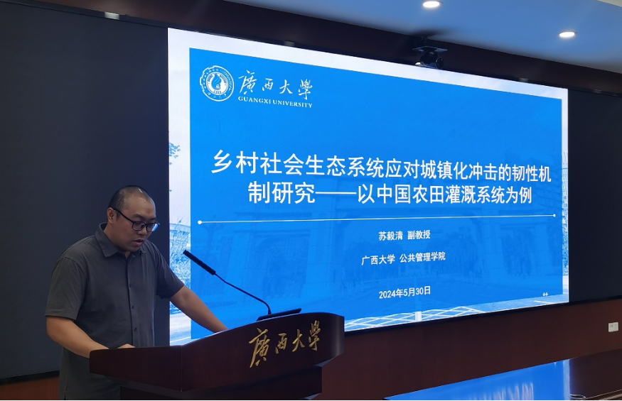 bevictor1946韦德官网公共管理公司土地资源管理系主任、副教授苏毅清作了以“乡村社会生态系统应对城镇化冲击的韧性机制研究—以中国农田灌溉系统为例”为主题的报告。他表示城镇化是发展中国家实现现代化的基本途径,在城镇化的影响下,有的乡村能够经受住外部冲击从而保持着发展的活力,而有的村庄却最终在外部冲击下走向了衰亡,并分析了在城镇化影响下劳动力外流对土地流转的非线性的影响。他指出确保乡村社会生态系统在城镇化影响下维持韧性的关键在于通过集体选择过程对操作过程提供制度规则保障。